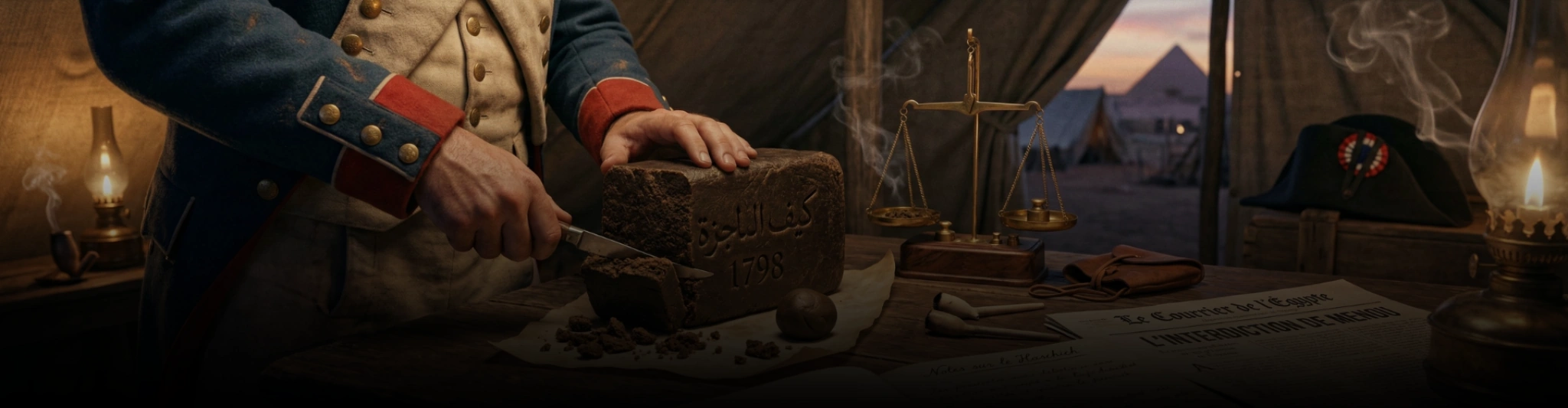 1798 – Les voiles de l’armée impériale française se gonflent dans le vent du désert égyptien. Napoléon Bonaparte, avec son regard d’aigle et ses ambitions grandioses, envahit l’Égypte avec deux objectifs : perturber les routes commerciales entre l’Inde et l’Angleterre et inscrire la domination française sur le Moyen-Orient comme une page de gloire dans les livres d’histoire. Mais, surprise, le plus grand défi de Napoléon ne viendra pas des sabres des mamelouks, mais du doux et envoûtant nuage de haschich qui flotte sur le pays des pharaons.
